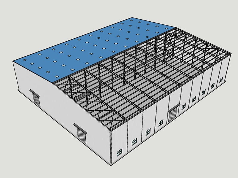 A 50m × 60m prefabricated steel warehouse covers a floor area of 3,000 square meters. The 50-meter width is divided into two spans of 25 meters each. The 60-meter length is divided into 10 bays, each 6 meters wide. This bay size is a common and economical choice.